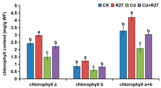 The contents of leaf chlorophyll a, b, and a + b in plants inoculated with R27 were also obviously higher under both non-Cd and Cd stress conditions (Figure 6). Under Cd stress, the leaf chlorophyll a, b, and a + b contents in lettuce seedlings inoculated with R27 increased by 49.0%, 37.7%, and 45.8%, respectively, compared with non-inoculated seedlings, which demonstrated that R27 could maintain leaf chlorophyll contents under Cd stress.