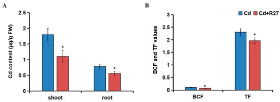 Effect of R27 strain on Cd content and Cd transport in lettuce. (A) The effects of R27 on the content of Cd; (B) the effects of R27 on the value of BCF and TF. Blue and red represent Cd (only Cd stress) and Cd + R27 (Cd stress + R27 inoculation) treatments. * Statistically significant differences (p < 0.05; t-test, n = 6, mean ± standard deviation).