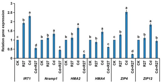 Effects of the R27 strain on the expression of genes related to Cd transport. Different letters indicate statistically significant differences between the four treatments (Duncan’s multiple range tests, p < 0.05; n = 3, mean ± standard deviation).