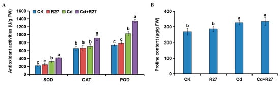 Unexpectedly, the changes in proline contents in plants did not agree with those in antioxidant activities. No significant difference was observed in the proline contents of the plants treated with R27 and non-treated controls under Cd and non-Cd stress conditions.