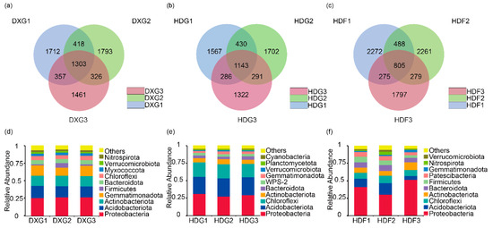 The Venn diagrams (a–c) illustrate that lower phosphorus fertiliser application rates were beneficial for maintaining bacterial community diversity ((a) DXG, (b) HDG, and (c) HDF). The graphs show the relative abundances of the bacterial community at the phylum level in the potato rhizosphere under different phosphorus fertiliser application rate conditions ((d) DXG, (e) HDG, and (f) HDF).