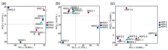 Principal component analysis (PCA) revealed changes in the bacterial community structure among the samples, with significant differences among the groups. Some community differentiation was presented among the treatments under different phosphate fertiliser application rates (Figure 2a–c). In the DXG samples (Figure 2a) under different phosphorus fertiliser treatments, the species differences among the DXG2, DXG1, and DXG3 samples were significant. In the HDG samples (Figure 2b), the trend of species similarity of the samples was consistent with that of the DXG soil samples, suggesting that the bacterial community composition was structurally more similar between the G1 and G3 treatments in the pot experiment. In the HDF samples (Figure 2c), the species differences among the HDF1, HDF2, and HDF3 samples were larger, suggesting that the bacterial communities under the F2 treatment were more similar in compositional structure to those under the F3 treatment in the field trial. Moreover, the comparison of the soil bacterial community structures, as explained through PC1 and PC2, showed that phosphorus fertiliser had a greater impact in the pot experiments than in the field trials.