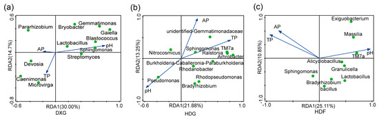 To analyse the correlation between different phosphorus fertiliser application rates and potato rhizosphere soil bacterial communities, RDA was conducted to examine the relationship between the relative abundance of microbial communities in the three soil samples and the AP, TP, and pH. Among them, in the DXG treatment (Figure 3a), Bryobacter, Gemmatimonas, and Blastococcus showed negative correlations with the TP and AP values and a positive correlation with the pH values. Similarly, in the HDG treatment, Rhodopseudomonas, Bradyrhizobium, and Rhodanobacter exhibited negative correlations with the TP and AP and a positive correlation with the pH. In the HDF treatment (Figure 3c), Lactobacillus, Bradyrhizobium, Massilia, Sphingomonas, and Bacillus also demonstrated negative correlations with the TP and AP and a positive correlation with pH. It is noteworthy that in the HDG treatment (Figure 3b), Ralstonia and TM7a showed positive correlations with the TP. In summary, total phosphorus (TP), available phosphorus (AP), and pH are significant environmental factors that influence the composition of bacterial communities.