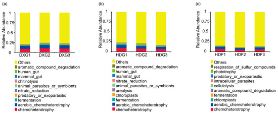Changes in the soil bacterial community may lead to changes in its overall metabolic function. Functional annotation of the prokaryotic taxa using FAPROTAX predicted the biogeochemical cycling processes of bacterial communities in potato rhizosphere soil under different phosphorus fertiliser rates. As shown in Figure 4, the results indicate that the top 10 relatively abundant functional groups detected in the three soil samples included chemoheterotrophy, nitrification, hydrocarbon degradation, etc. In the DXG soil sample (Figure 4a), under different phosphorus levels, chemoheterotrophy, aerobic chemoheterotrophy, and fermentation had the highest relative abundances in the moderate phosphorus treatment. In the HDG soil sample (Figure 4b), chemoheterotrophy, aerobic chemoheterotrophy, and fermentation had the highest relative abundances under the low-phosphorus treatment, whereas the relative abundance of aerobic ammonia oxidation tended to increase with increasing phosphorus application rates. In the HDF soil sample (Figure 4c), chemoheterotrophy and aerobic chemoheterotrophy had the highest relative abundances under the moderate phosphorus treatment. The relative abundance of chemoheterotrophy, aerobic chemoheterotrophy, fermentation, ureolysis, and animal parasites or symbionts decreased with the increase in phosphate fertiliser. Overall, lower phosphorus fertiliser application rates were conducive to maintaining the relative abundance of the main functional groups in the cycling mode, with chemoheterotrophy being the main metabolic pattern of the bacterial community in the potato rhizosphere soil, followed by aerobic chemoheterotrophy, fermentation, aromatic compound degradation, and nitrate reduction. These patterns were present in the soils from both Dingxi and Huidong, indicating that bacterial communities actively participate in the biogeochemical cycling processes of carbon, hydrogen, nitrogen, and other elements in potato rhizosphere soil.