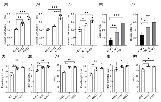 The relative abundance of txtA in pathogenic Streptomyces in potatoes under different phosphorus application rates and the incidence of potato CS in HDF. The relative abundances of txtA in (a) DXG, (b) HDG, and (c) HDF; (d) the incidence of CS disease in HDF; (e) disease severity index in HDF; (f) plant height in DXG; (g) stem diameter in DXG; (h) SPAD in DXG; (i) plant height in HDG; (j) stem diameter in HDG; (k) SPAD in HDG. * Significant at p < 0.05, ** significant at p < 0.01, and *** significant at p < 0.001.