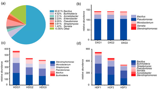 Phosphate fertiliser application rate effects on the abundance of antagonistic bacteria against S. scabies. (a) A pie chart depicting the distribution of major antagonistic bacterial genera in the potato rhizosphere. Stacked bar charts at the genus level showing the relative abundance of antagonistic bacteria ((b) DXG, (c) HDG, (d) HDF).