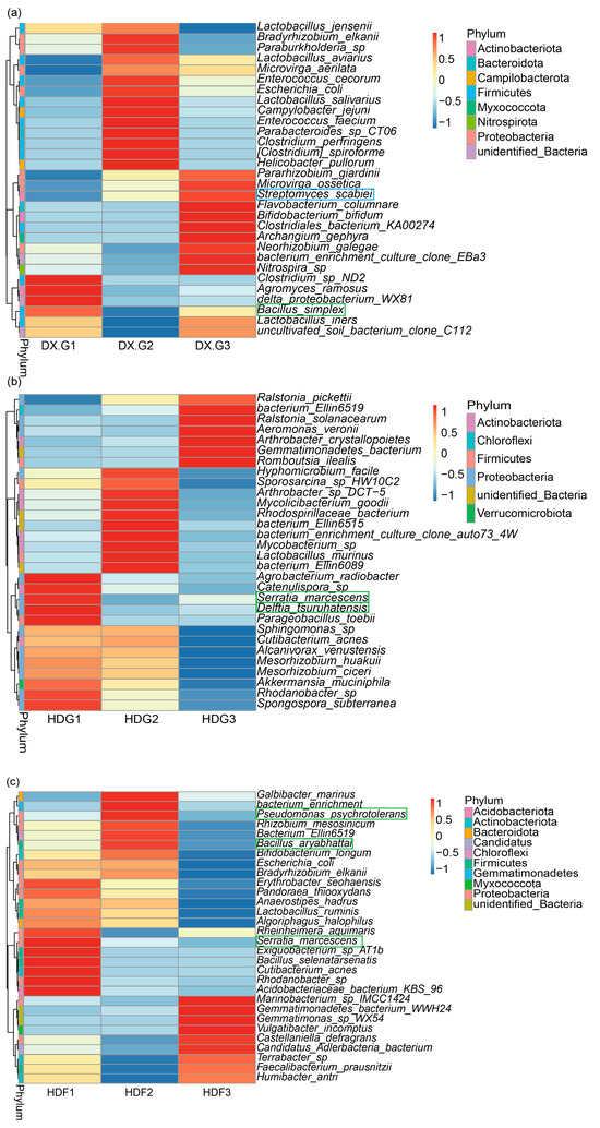 Clustered heat map of relative abundances of the top 30 bacterial species at the species level ((a) DXG, (b) HDG, and (c) HDF). The green boxes mark the antagonistic bacteria and the blue boxes mark the pathogenic bacteria. The chromatograms, from red to blue, indicate a gradual decrease in the abundance of bacterial populations.