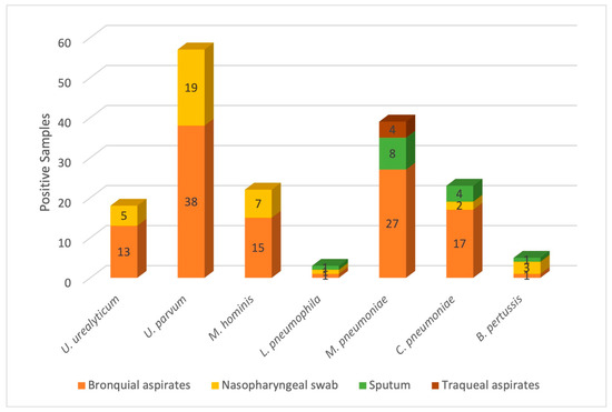 Absolute frequency of atypical pathogens. The figure shows the number of cases for which atypical bacteria were identified, as well as the type of sample in which identification was performed. As observed, bronchial aspirates were found to exhibit the highest positive sample rates.