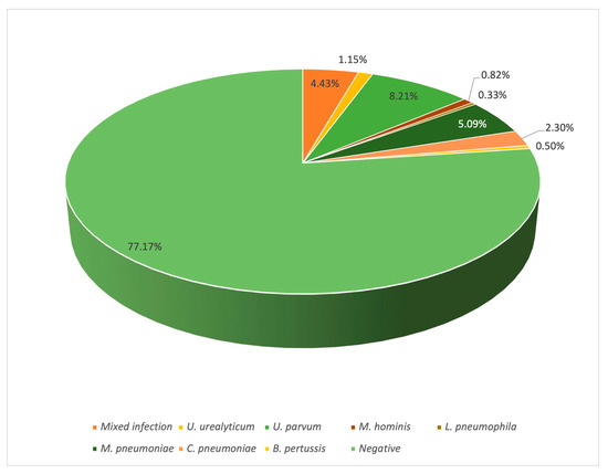 Both the absolute and relative frequencies of the atypical bacteria were determined in this study. A total of one-hundred-forty samples exhibited at least one atypical organism (22.83%), where one-hundred-thirteen presented one bacterium; twenty-six samples presented two bacteria, and there were three clinical cases in which up to three bacteria were identified. As represented in Figure 1 and Figure 2, U. urealyticum was observed in up to eighteen patients (2.95%), while U. parvum was identified in fifty-seven patients (9.35%), M. hominis in twenty-two patients (3.61%), L. pneumophila in three patients (0.49%), M. pneumoniae in thirty-nine patients (6.40%), C. pneumoniae in twenty-three patients (3.77%), and B. pertussis in five patients (0.82%). Although the types of samples present some limitations due to their composition, such as sputum containing a high concentration of mucus or nasopharyngeal exudates that exhibit low cellularity, the use of N-acetyl-cysteine and glycogen made it possible to extract DNA and molecularly identify the atypical bacteria (Figure 1).
