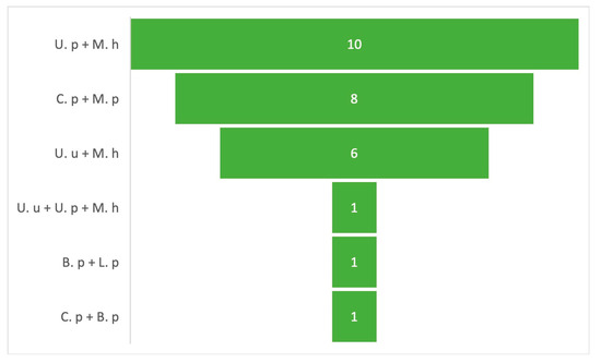 Clinical cases of mixed infections. The figure shows the frequency of mixed infections identified in the study. U. u: U. urealyticum, U. p: U. parvum, M. h: M. hominis, M. p: M. pneumoniae, C. p: C. pneumoniae, L. p: L. pneumophila, and B. p: B. pertussis.