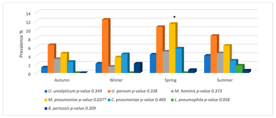 Prevalence of atypical pathogens according to the four seasons. p-value < 0.05: statistically significant difference between the seasons and the presence of each pathogen.