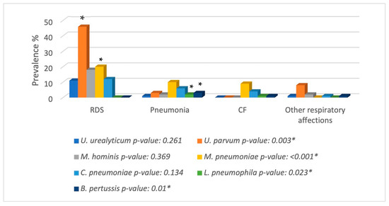 Some studies have correlated the presence of mycoplasma with RDS. In this investigation, the results strongly suggest a statistically significantly higher probability of identifying U. parvum and M. pneumoniae in patients diagnosed with this syndrome compared to patients diagnosed with pneumonia, CF, or another respiratory disease. RDS can be considered a pre-stage to an event of pneumonia or another respiratory disease. Therefore, it is important for physicians to recognise these types of pathogens and their presence in clinical cases of RDS in order to provide a specific treatment before the patient’s respiratory problem worsens [25].