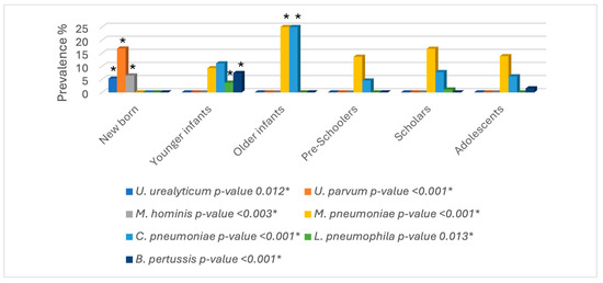 The highest prevalence rate of U. parvum was observed exclusively in newborn patients, followed by M. pneumoniae, which was present in most paediatric age groups, with greater statistical significance within the older infant group. However, Waites et al. (2017) found a higher proportion of M. pneumoniae in school-aged and adolescent groups, while Rueda et al. 2019 observed a higher prevalence of M. pneumoniae in preschoolers [6,20].