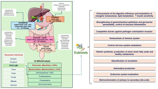 In the small intestine, the transit time is about 3–5 h and the presence of bile acids in bile has antimicrobial activity [54,55,56,57]. At this level, the community is mainly composed of facultative anaerobes, including phyla Proteobacteria and Bacteroides populated by Streptococci, Lactobacilli, and Enterococci species [58,59].