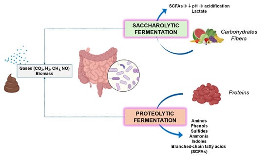 In general, carbohydrates contribute as energy sources and as fermentative substrates to produce key biomolecules for the host [129]. By contrast, if carbohydrates are not sufficient, bacteria will switch to an alternative energy source, i.e., proteolytic, with metabolites potentially harmful to human health [24].