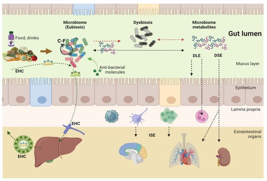 Effects of microbiome metabolites on the immune system and different targets. Food and nutrients encounter the microbiome highly represented in the colon. The microbiota metabolites serve as the nutrients for some bacteria and can shape the composition of the gut microbiome in health (eubiosis) and disease (dysbiosis). Bacterial cross-feeding (C-F) is when one bacterium is taken up by or exchanges its bacterial products with another microbe (e.g., lactate). Bacterial metabolites can act in different ways, i.e., by direct local effect (DLE) on either enterocytes and/or immune cells in the lamina propria. Such local effects can activate further systemic pathways. Microbiome metabolites can be absorbed and transported to remote organs to exert direct systemic effects (DSEs) or elicit indirect systemic effects (ISEs). Metabolites can also induce the host to release antibacterial molecules into the gut lumen. Enterohepatic circulation (EHC) is another example of the biotransformation of secreted primary bile acids to secondary bile acids by the resident colonic microbiome. Created with Biorender.com.