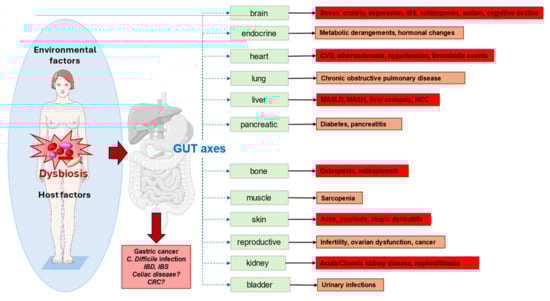 Potential clinical consequences of gut dysbiosis. With dysbiosis, the classical axes originating from the gut microbiota (green boxes) can be disrupted at various levels (red/orange boxes) and will contribute to the onset/perpetuation of disease. Local (gut) consequences are also shown. Abbreviations: CRC, colorectal cancer; CVD, cardiovascular disease; HCC, hepatocellular carcinoma; IBD, inflammatory bowel disease; IBS, irritable bowel disease; MASH, metabolic dysfunction-associated steatohepatitis; MASLD, metabolic dysfunction-associated steatotic liver disease. Created with https://smart.servier.com/.