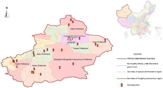 The map shows the locations of sampling sites across various prefectures in Xinjiang, marked by red pins. Prefectures include Aksu, Altay, Kashi, Hotan, Hami, Turpan, and Bayingolin Mongolian Autonomous Prefecture, with notable cities such as Urumqi and Changji Hui Autonomous Prefecture also highlighted. The boundaries of Xinjiang, China’s international borders, and various administrative regions are outlined, with a smaller inset map showing the location of Xinjiang within China.
