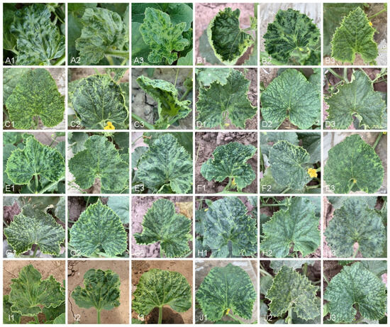 The images show different degrees of chlorosis, mosaic patterns, and leaf deformation in melon plants across treatments. Panels (A1–J3) depict variations in disease symptoms such as yellowing, curling, and blistering. Each row represents a different set of treatments, with individual images (A1–J3) highlighting specific responses of the leaves to potential stressors. These visible symptoms suggest the presence of viral or environmental stress, with severity and patterns differing across the treatments.