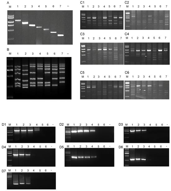 (A). The specificity analysis results of the multiplex RT-PCR detection method. The detection samples corresponding to lanes 1 to 7 only contain WMV, CMV, ZYMV, SqMV, TMV, PRSV, and MYSV, respectively. (B). The sensitivity tests of the multiplex RT-PCR detection method. The drop-out experiments were carried out to test the specificity of this multiplex RT-PCR, in which one pair was removed at a time to see whether the rest of the primers had cross-reacted.; lane 1: healthy plant (negative control); lane 2: detection of MYSV; lane 3: detection of PRSV; lane 4: detection of TMV; lane 5: detection of SqMV; lane 6: detection of ZYMV; lane 7: detection of CMV. (C1). Detection results of using different Mg2+ concentrations in multiplex RT-PCR amplification system. lane 1: at 1.0 mol/L; lane 2: at 1.5 mmol/L; lane 3: at 2.0 mmol/L; lane 4: at 2.5 mmol/L; lane 5: at 3.0 mmol/L; lane 6: at 3.5 mmol/L; lane 7: at 4.0 mmol/L. (C2). Detection results of using different template cDNA volumes in multiplex RT-PCR amplification system. lane 1: at 0.5 μL; lane 2: at 0.75 μL; lane 3: at 1 μL; lane 4: at 1.25 μL; lane 5: at 1.5 μL; lane 6: at 1.75 μL; lane 7: at 2 μL. (C3). Detection results of using different primer amounts in a multiplex RT-PCR amplification system; lane 1: at 2 × 10−5 μmol, and molar ratios of primers for WMV, CMV, ZYMV, SqMV, TMV, PRSV, and MYSV is 1:1:1:1:1:1:1; lane 2: at 2 × 10−5 μmol, and molar ratios of primers for WMV, CMV, ZYMV, SqMV, TMV, PRSV, and MYSV is 2:2:2:1:1:1:1; lane 3: at 2 × 10−5 μmol, and molar ratios of primers for WMV, CMV, ZYMV, SqMV, TMV, PRSV, and MYSV is 10:9:8:8:5:5:3:3; lane 4: at 5 × 10−5 μmol, and molar ratios of primers for WMV, CMV, ZYMV, SqMV, TMV, PRSV, and MYSV is 1:1:1:1:1:1:1; lane 5: at 5 × 10−5 μmol, and molar ratios of primers for WMV, CMV, ZYMV, SqMV, TMV, PRSV, and MYSV is 2:2:2:1:1:1:1; lane 6: at 5 × 10−5 μmol, and molar ratios of primers for WMV, CMV, ZYMV, SqMV, TMV, PRSV, and MYSV is 10:9:8:8:5:5:3:3; lane 7: at 7 × 10−5 μmol, and molar ratios of primers for WMV, CMV, ZYMV, SqMV, TMV, PRSV, and MYSV is 1:1:1:1:1:1:1. (C4). Detection results of using different dNTP concentrations in multiplex RT-PCR amplification system; lane 1: at 0.2 mmol/L; lane 2: at 0.4 mmol/L; lane 3: at 0.6 mmol/L; lane 4: at 0.8 mmol/L; lane 5: at 1.0 mmol/L; lane 6: at 1.2 mmol/L; lane 7: at 1.4 mmol/L; (C5). Detection results of different amounts of Taq DNA polymerase in multiplex RT-PCR amplification system; lane 1: at 0.25 U; lane 2: at 0.5 U; lane 3: at 0.75 U; lane 4: at 1.0 U; lane 5: at 1.25 U; lane 6: at 1.5 U; lane 7: at 1.75 U. (C6). Detection results of using different annealing temperatures in multiplex RT-PCR method; lane 1: at 50 °C; lane 2: at 51 °C; lane 3: at 52 °C; lane 4: at 53 °C; lane 5: at 54 °C; lane 6: at 55 °C; lane 7: at 56 °C. (D). The detection limits of the multiplex RT-PCR assays. The detection limits of this multiplex PCR were conducted by a series of sensitivity tests. The positive clone vector was adjusted to the same initial concentration and diluted serially ten-fold (105 to 1010 copies/μL) to serve as a template in the optimized multiplex PCR. (D1). The detection limits of WMV; 1–6 stand for 105 to 100 copies/μL. (D2). The detection limits of CMV;1–6 stand for 105 to 100 copies/μL. (D3). The detection limits of ZYMV; 1–6 stand for 105 to 100 copies/μL (D4). The detection limits of SqMV; 1–6 stand for 105 to 100 copies/μL. (D5). The detection limits of TMV; 1–6 stand for 105 to 100 copies/μL. (D6). The detection limits of PRSV; 1–6 stand for 105 to 100 copies/μL. (D7). The detection limits of MYSV; 1–6 stand for 105 to 100 copies/μL. ”–“represents deionized water as control. M: DNA marker (100 bp–2000 bp).