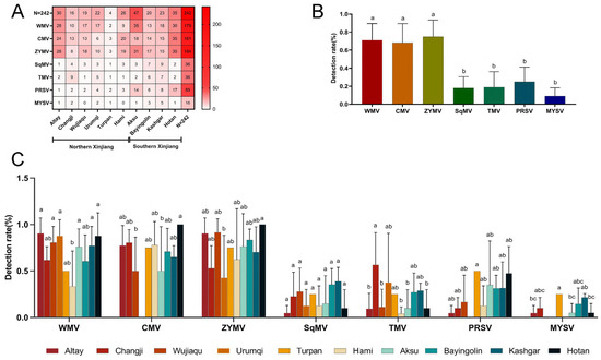 (A). The heatmap displays the distribution and frequency of various viral diseases affecting melon crops across different regions in northern and southern Xinjiang. The regions include Altay, Changji, Wujiaqu, Urumqi, Turpan, Hami, Aksu, Bayingolin, Kashgar, and Hotan. Viral diseases represented are Watermelon Mosaic Virus (WMV), Cucumber Mosaic Virus (CMV), Zucchini Yellow Mosaic Virus (ZYMV), Squash Mosaic Virus (SqMV), Tobacco Mosaic Virus (TMV), Papaya Ringspot Virus (PRSV), and Melon Yellow Spot Virus (MYSV). The color intensity corresponds to the number of cases, with red indicating higher incidence. The total number of cases (N = 242) per virus and per region is shown, with regions in southern Xinjiang showing a generally higher disease incidence compared to northern Xinjiang. (B). This figure shows the results of differential analysis of detection rates among different viruses in the Xinjiang region. The data of each virus detection rate on the horizontal axis is the average of the virus detection rates in 10 locations in Xinjiang. This figure shows the analysis results of the differences in virus detection rates between different regions. The horizontal axis represents different virus types, and the vertical axis represents virus detection rates. (C). Detection rate of Watermelon Mosaic Virus (WMV), Cucumber Mosaic Virus (CMV), Zucchini Yellow Mosaic Virus (ZYMV), Squash Mosaic Virus (SqMV), Tobacco Mosaic Virus (TMV), Papaya Ringspot Virus (PRSV), and Melon Yellow Spot Virus (MYSV) at different locations of Xinjiang. The reaction experimental results of lowercase letters reach the 0.05 significance level. Different letters represent significant differences between groups, and the same letters or shared letters represent insignificant differences between groups.