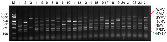 Results of multiplex RT-PCR detection method for virus disease samples from different regions; M: Marker; 1–24: Samples of melon plants infected by virus diseases in different regions of Xinjiang.