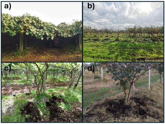 Sampling layout and orchard conditions. (a) Asymptomatic and (b) symptomatic kiwifruit orchard. Detailed view of kiwifruit trees with designated sampling points around the trunk for (c) asymptomatic and (d) symptomatic trees with the five specific sampling locations around each trunk.