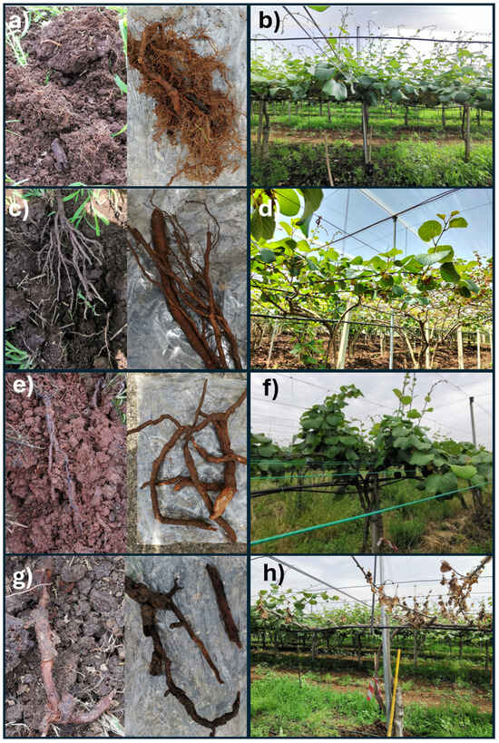 Scoring scale for disease severity (0–3) for epigeal and hypogeal symptoms in kiwifruit plants. Epigeal symptoms: (b) no symptoms (healthy plant); (d) mild symptoms (plant decline sometimes visible through reduced shoot growth, leaf chlorosis, fewer new shoots, and smaller leaves); (f) severe symptoms (leaf drop, fruit drop, reduced fruit size if present, and overall vine decline); (h) dead plant. Hypogeal symptoms: (a) no symptoms (healthy roots); (c) mild symptoms (reduction of absorbent roots and visible necrosis); (e) severe symptoms (decay of primary roots, near-complete rot of secondary roots, loss of cortical tissue, “rat-tail” appearance, and loss of absorbent roots); (g) dead roots. For root symptoms, images show roots during sampling (left) and after washing (right).
