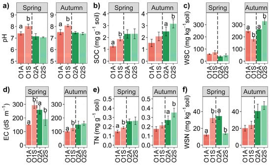 Bar chart of soil physicochemical properties of Orchards 1 and 2 in Spring and Autumn. (a) pH, (b) SOC: soil organic carbon content, (c) WSC: soil water-soluble C, (d) EC: electrical conductivity, (e) TN: total soil nitrogen content, (f) WSN: soil water-soluble N, and the letters A and S indicate Asymptomatic and Symptomatic, respectively. Different letters (a, b) indicate significant differences based on One-Way ANOVA results at p < 0.05. Error bars represent the standard error of the mean (4 replicates).