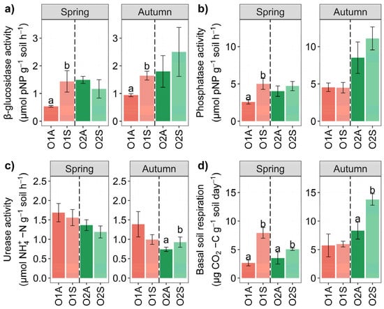 Bar chart of β-glucosidase (μmol PNF g−1 soil h−1) (a), alkaline phosphatase (μmol PNF g−1 soil h−1) (b), urease (μmol NH4+ g−1 soil h−1) (c), and basal soil respiration (BSR) (mg CO2 kg−1 soil day−1) (d) of Orchard 1 and 2 in Spring and Autumn. The letters A and S indicate Asymptomatic and Symptomatic, respectively. Different letters (a, b) indicate significant differences based on One-Way ANOVA results at p < 0.05. Error bars represent the standard error of the mean (4 replicates).