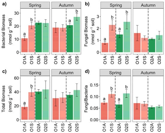 Bar chart of biomass abundance (nmol g−1 soil h−1) divided into Bacteria (a), Fungi (b), Gram- Total Biomass (c), Fungi/Bacteria ratio (d), of Orchard 1 and 2 in Spring and Autumn. Different letters (a, b) indicate significant differences based on One-Way ANOVA results at p < 0.05. Error bars represent the standard error of the mean (4 replicates).