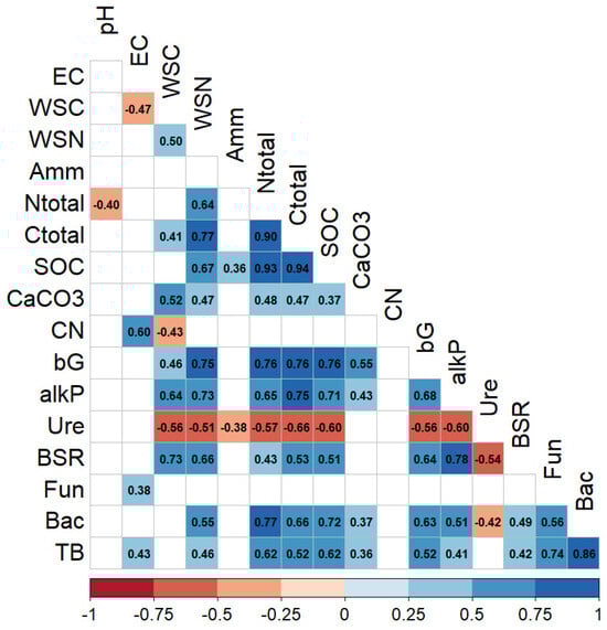 Heat map of Spearman’s correlation for soil and physiological parameters. Negative and positive correlations are represented in blue and red, respectively. All correlations are significant at p < 0.05. EC: electrical conductivity, WSC: soil water-soluble C, WSN: soil water-soluble N, Amm: soil ammonium content, Ntotal: total soil nitrogen content, C total: total soil carbon content, SOC: soil organic carbon, CaCO3: soil carbonate calcium content, CN: carbon/nitrogen ratio, bG: β-glucosidase activity, alkP: alkaline phosphatase activity, Ure: urease activity, BSR: basal soil respiration, Fun: soil fungal biomass, Bac: soil bacterial biomass, TB: total soil microbial biomass.