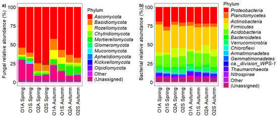 Composition of fungal (a) and bacterial (b) abundance at phylum level in Orchards 1 and 2 in Spring and Autumn.