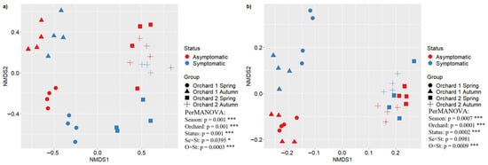 NMDS analysis of fungal community (a) and bacterial community (b) from Orchard 1 in Spring (dot) and Autumn (triangle), and Orchard 2 in Spring (square) and Autumn (cross). The asymptomatic and symptomatic samples are shown in red and blue, respectively. For the PerMANOVA test, the significance levels are shown at * p ≤ 0.05, and *** p ≤ 0.001. O×C means orchard and status interaction.