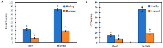 Effects of root rot on the fresh weight (A) and dry weight (B) of both the shoot and rhizoma in L. chuanxiong. Different lowercase letters positioned above the error bars indicate statistically significant differences (p < 0.05; Duncan’s test).