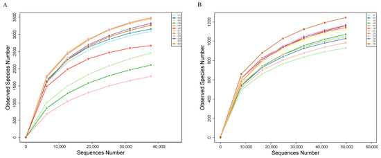 Based on the barcode-labeled sequence, a total of 12 soil samples were identified and differentiated. From these samples, a cumulative total of 1,008,575 circular consensus sequencing (CCS) reads, annotated with fungal species, was acquired. The number of CCS reads per sample varied between 79,046 and 90,873, yielding an average of 84,048 reads per sample. A cumulative total of 833,623 CCS reads, annotated with bacterial species, was acquired. The number of CCS reads for each sample varied, ranging from 57,627 to 86,595, with an average of 69,469 CCS reads per sample. Following the filtering of barcoded-CCS reads for quality and the elimination of chimeras, over 98% of the effective reads were achieved. Each sample yielded an average of 64,482 fungal optimized-CCS reads, with more than 95% of the reads maintaining a quality score ≥30. Each sample generated an average of 52,265 optimized bacterial CCS reads, with 97% effective sequences, and over 93% of the reads had a quality score of ≥30 (Table S1). Obviously, the rarefaction curves for bacterial and fungal OTUs began to level off once the sequencing quantity for both fungi and bacteria hit 20,000, which implies that the samples encompassed the majority of the microbiomes present in the rhizosphere (Figure 2). These results suggested that the data were adequate for further statistical analysis.