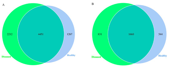 On average, 12 soil samples generated 7930 bacterial OTUs and 3035 fungal OTUs, achieving coverage rates of over 97% and 98%, respectively. This suggests that the sequencing depth for all samples was adequate, making it appropriate for further analysis of the microbial communities present in the samples. The Venn diagrams visually represented the overlap of OTUs between healthy and diseased samples, showing both shared and unique OTUs. The analysis of bacterial OTUs revealed that 4451 OTUs were common to both healthy and diseased samples, while there were 1267 unique to healthy samples and 2212 unique to diseased samples (Figure 3A). Fungal OTUs analysis indicated that 1660 OTUs were shared by healthy and diseased samples, while the number of fungal OTUs that were unique to healthy samples was 544, and for diseased samples, it was 831 (Figure 3B). When exposed to pathogen invasion, the quantity of bacterial and fungal OTUs unique to rhizosphere soil increased in comparison to that of healthy plants. Therefore, after the infection of root rot, new species of bacteria and fungi have appeared in rhizosphere of L. chuanxiong. From the perspective of species, convergence and variation coexist, and the community structure has undergone complex and subtle changes.