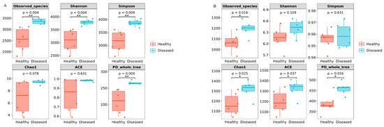 Alpha diversity was used to evaluate the abundance, variety, and uniformity of bacteria and fungi present in the rhizosphere soil. In the case of bacteria, the diseased rhizosphere soil possessed notably higher values of Shannon, Simpson, and PD_whole tree indices compared to the healthy soil, indicating a greater bacterial diversity in the diseased soil (p < 0.05, Figure 4A). A minimal increase and difference were noted in Chao1 and ACE, suggesting that there is no significant variation in bacterial richness and evenness between healthy and diseased soil (p > 0.05, Figure 4A). In the case of fungi, the diseased soil exhibited higher levels across all metrics, with notable differences found in the Observed_species index as well as in the Chao1 and ACE indices (p < 0.05, Figure 4B). This indicates a comparatively greater fungal richness in the diseased soil. The variation in the Shannon and Simpson indices between healthy and diseased soil was not statistically significant (p > 0.05, Figure 4B), indicating that there is a similar level of diversity and evenness in both types of soil. Notably, the indexes for bacteria and fungi in diseased soil were considerably greater than those in healthy soil, indicating a higher abundance, diversity, and evenness of bacterial and fungal populations in the diseased soil compared to the healthy soil (Table S2).