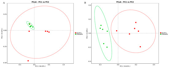 The results of the PCoA, utilizing Bray–Curtis distances, indicate that the composition of rhizosphere bacteria exhibited certain similarities between healthy and diseased soils (Figure 5A). In contrast, the rhizosphere fungal communities in these soils displayed significant differences and were distinctly separated (Figure 5B). Furthermore, the first two principal components (PC1 and PC2) of the PCoA collectively explained 48.90% of the variance observed in rhizosphere fungal communities.