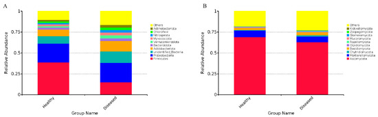 Taxonomic summary of the relative abundance of the rhizosphere bacterial phyla (A) and fungal phyla (B) in healthy and diseased soil.