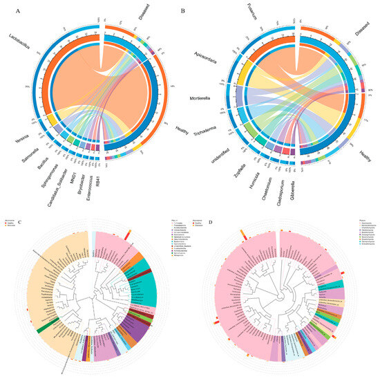 Taxonomic summary of the relative abundance of the rhizosphere bacterial genera (A) and fungal genera (B) in healthy and diseased soil; Phylogenetic trees of the top 100 genera of bacteria (C) and fungi (D) based on their relative abundance.
