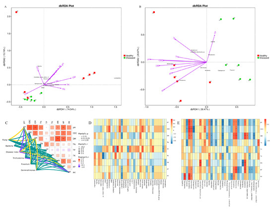 The association between multiple environmental factors and the composition of microbial communities was clarified through the use of redundancy analysis. The findings indicated that pH, OM, AK, and TP were significant determinants in shaping both bacterial and fungal communities (Figure 8A,B). Additionally, CEC and TN in the soil had a notable impact on the assembly of fungal communities (Figure 8B). In addition, the Mantel test revealed that there was no notable correlation between the rhizosphere bacteria and the soil environmental factors. In contrast, a significant positive correlation was found between pH and the concentration of soil OM with the rhizosphere fungi (p < 0.05, Figure 8C). Furthermore, the severity of root rot was notably influenced by pH, CEC, and the levels of soil OM, AN, AP, and AK (Figure 8C; Table S7). Correlation analysis conducted at the genus level indicated that the genus Lactobacillus, which exhibited the highest abundance in healthy soil, demonstrated a positive correlation with the concentrations of soil OM, AN, and TK (Figure 8D). Moreover, a highly significant positive correlation was identified between the concentration of soil AK and the abundance of Trichoderma and Apiosordaria (p < 0.01, Figure 8C,E). In contrast, the abundance of Fusarium exhibited a significant negative correlation with pH, CEC, and TN (p < 0.05, Figure 8C,E). Additionally, the concentration of soil OM demonstrated a substantial influence on Gemmatimonas (Figure 8C). These findings suggest that pH and OM may play a critical role in shaping the structure of the fungal community. Maybe it is helpful to control root rot by raising soil pH or increasing potassium fertilizer content.
