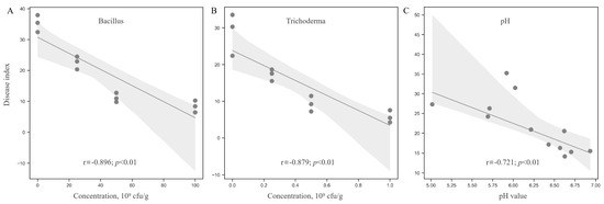 The interconnections among keystone microbiomes, soil pH levels, and the disease index associated with root rot. (A) Disease index of root rot in response to the concentration of Bacillus; (B) Disease index of root rot in response to the concentration of Trichoderma; (C) Disease index of root rot in response to soil pH. The shaded area represents the 95% confidence interval for the corresponding regression lines.