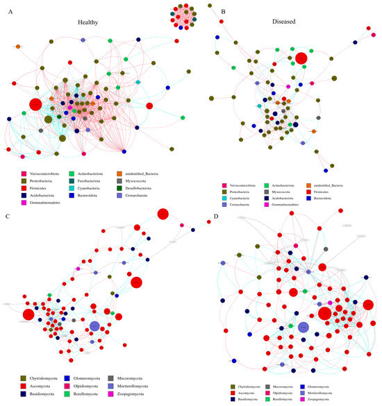 Co-occurrence networks of bacterial and fungal amplicon sequence variants in both healthy and diseased soil. Edges colored in red indicate positive correlations; edges in green indicate negative correlations. (A) Bacteria in healthy; (B) bacteria in diseased; (C) fungi in healthy; and (D) fungi in diseased. The different sizes of circles represent the abundance of the taxa of microbes, the larger the circle, the higher the abundance.