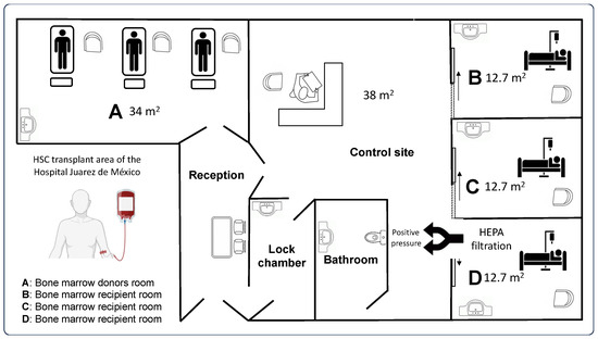 The HSC transplant area has the necessary infrastructure for patient care according to the recommendations reported by Inkster et al. (2022), such as air filtration and hourly air changes (ACH) (room D only), room sealing with sanitary finishing, and epoxy-coated floors, among others []. Figure 1 shows the aerial-view map of the HSC transplant area at HJM, and Table 1 shows the infrastructure characteristics per room in the HSC transplant area.