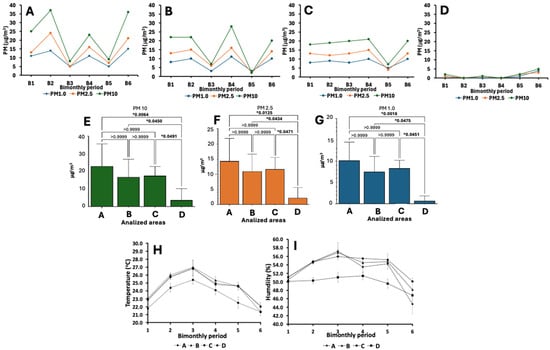 Figure 2A–G show the results of the PM10, PM2.5, and PM1.0 μm quantification from the HSC transplant rooms at HJM and the Tukey’s post hoc analysis and ANOVA for the statistical comparison of the PM levels between the rooms. Simultaneously with these determinations, measurements of the ambient temperature and RH were performed. The results revealed average maximum temperature and RH values of 27 ± 0.4 °C and 57.2 ± 0.2%, respectively. Conversely, the minimum values of these same parameters were between 21.8 ± 0.3 °C and 44.8 ± 0.1%. Interestingly, these maximum and minimum values were directly related to the seasonality for warm months and cold months (B3 “May–June”) and (B4 “July–August”); however, regarding room D, it was the room with the lowest temperature and RH values during the study period. Figure 2H,I show the results of the temporal analysis of the temperature and RH in the HSC transplant area at HJM.