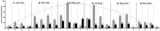 The lowest microbiological loads were identified in the two-month periods at the extremes of the year, in winter (January/April) and autumn (October/December). The highest peak bacterial loads were represented by Gram-positive bacteria, followed by fungi and Gram-negative bacteria. Figure 3 shows the seasonal analysis (bimonthly) of the aerobiome microbiological loads that were analyzed in the HSC transplant rooms at HJM from January to December 2023.