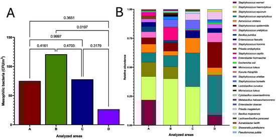 No differences between rooms A, B, and C were identified. In microbiological terms, it was observed that the degree of bacterial contamination was similar between rooms without HEPA filtration and positive pressure. Figure 4A shows the results of the ANOVA and Tukey’s post hoc test for the statistical comparison of the bacterial aerobiome, and Figure 4B summarizes the findings of the bacterial identification by mass spectrometry of the culturable aerobiome in the HSC transplantation area at HJM.