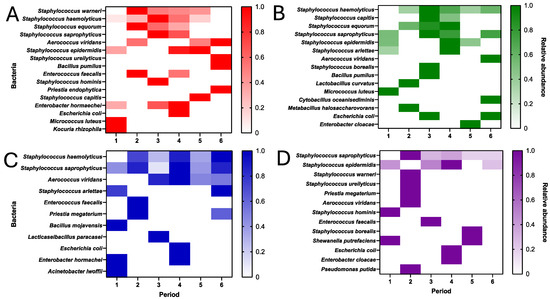 As part of the analysis of the bacterial aerobiome, a longitudinal follow-up study of the behavior of the bacterial aerobiome per m3 of the HSC transplant area during the study period was carried out. For this purpose, heat maps were created of each of the rooms analyzed, using the information on the relative abundance and taxonomic diversity per m3 identified by mass spectrometry. The results revealed that species of the genus Staphylococcus showed a reduction in relative abundance during the bimonthly course of the study period. Species such as S. warneri, S. haemolitycus, S. equorum, and S. saprophyticus showed this behavior in the donor (A) and recipient (B and D) rooms (Figure 5).