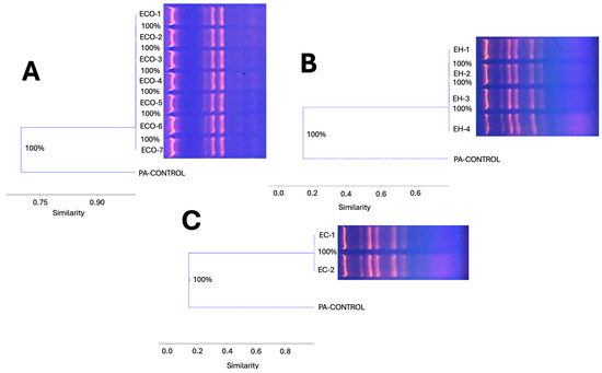Genomic diversity (clonal dispersion) by dendrogram construction of ESKAPE bacteria detected in aerobiome in HSC transplant rooms of the Hospital Juárez de México. Escherichia coli (A), Enterobacter hormaechei (B), and E. cloaceae (C). PA (Pseudomonas aeruginosa as internal control).